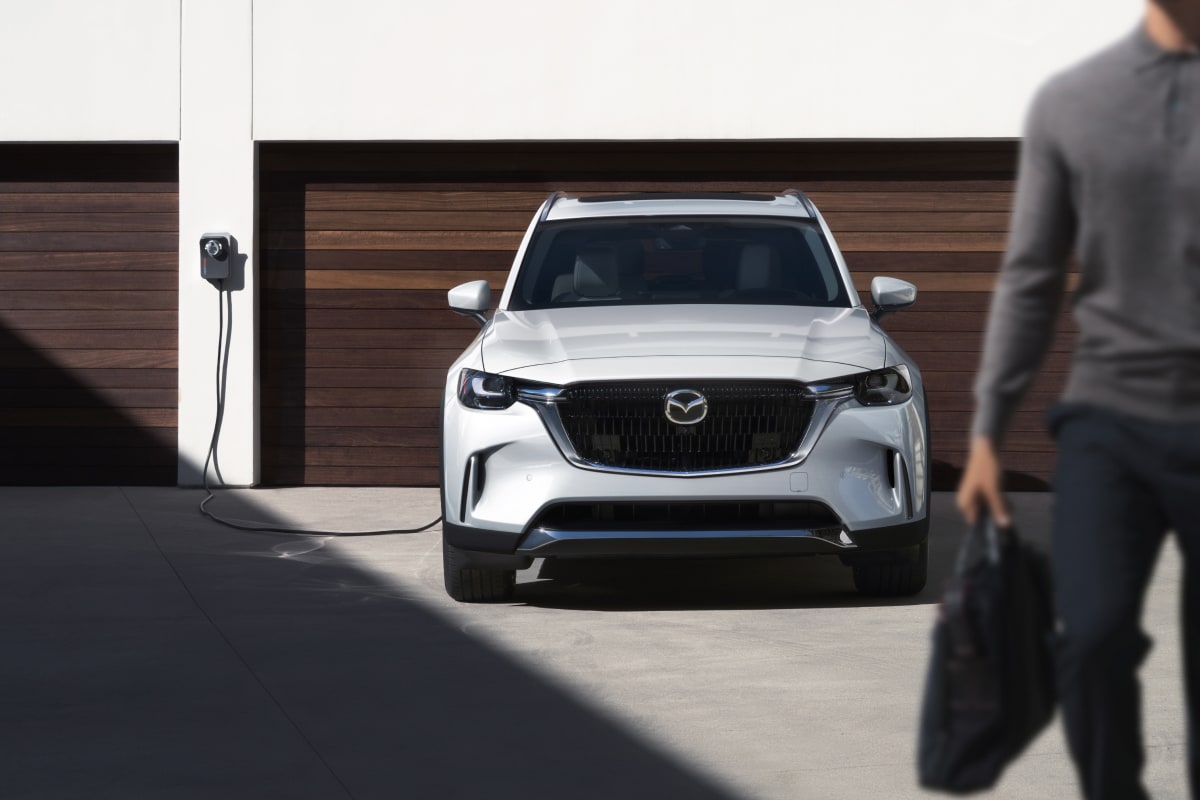 Thanks to its versatile charging port, charging a Mazda CX-90 PHEV is easy. Using the portable Level 1 charging cable that comes with your CX-90 Plug-In Hybrid, simply plug your vehicle into a regular wall socket to draw electricity directly from the grid. If you are looking to get the job done faster, you can install a universal Level 2 home charger to deliver a faster supply of power.