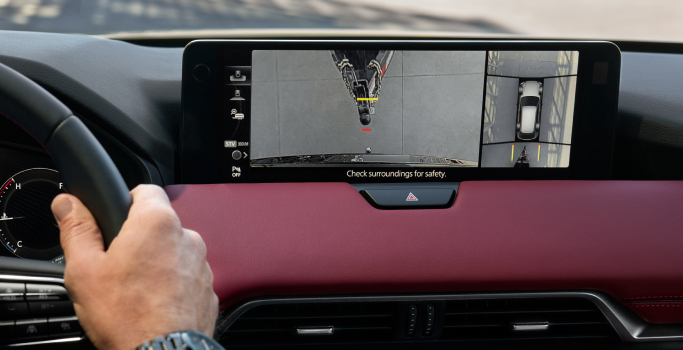 Enhancements available exclusively with the Genuine Mazda Accessory tow hitch include 360° View Monitor with Trailer Hitch View and Towing Mode. 360° View Monitor with Trailer Hitch View is a function that combines the image of the vehicle rear with the Trailer Hitch Guideline on the center display to facilitate alignment when hitching a trailer to the vehicle, while Towing Mode optimizes driving performance when towing a trailer to help prevent sway and improve the vehicle stability.17